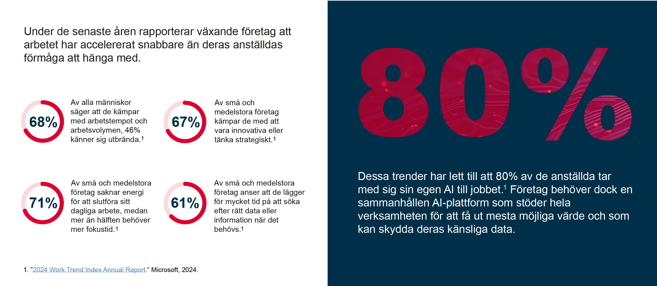 Säkerhet och kontroll: Med IT-kontroller, inklusive dataskydd för företag och agenthantering, kan du vara säker på att dina känsliga data är skyddade. Copilot ger dig en sammanhållen AI-plattform som stöder hela verksamheten.