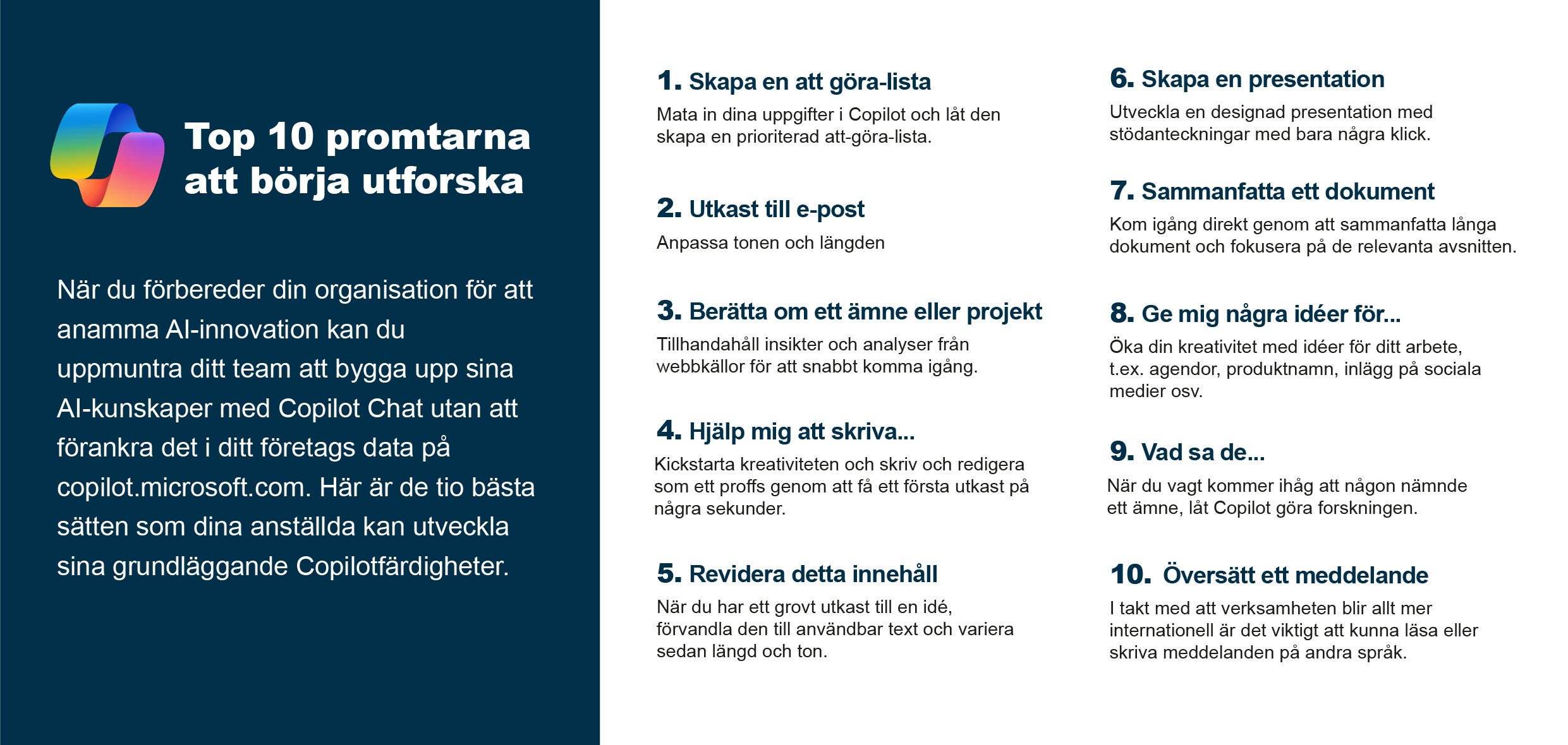 - Stärka medarbetarengagemanget: Minska risken för utbrändhet och frustration hos anställda genom att använda Copilot för att effektivisera tidskrävande och repetitiva uppgifter